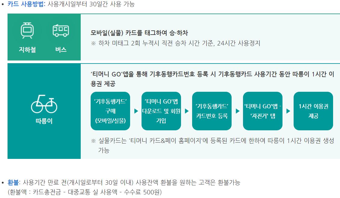 기후동행카드는 1회 요금 충전으로 30일간 대중교통(지하철, 버스), 따릉이를 무제한 이용할 수 있는 대중교통 통합 정기권입니다.