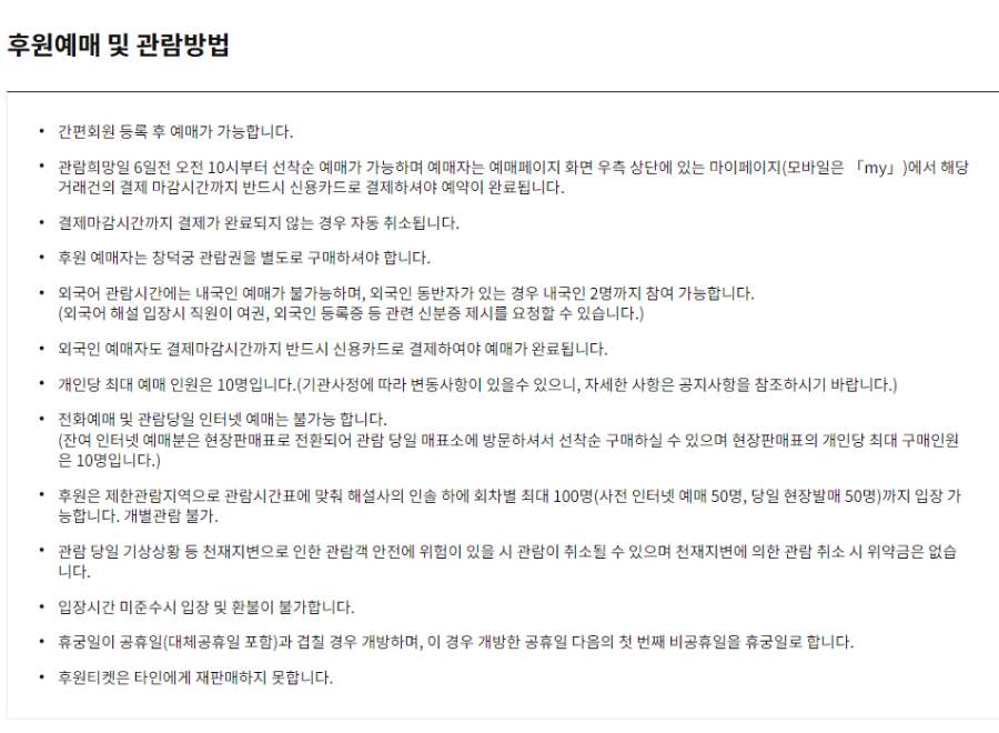 예매는 관람 희망일 6일 전 오전 10시부터 선착순으로 예매가 가능하며,