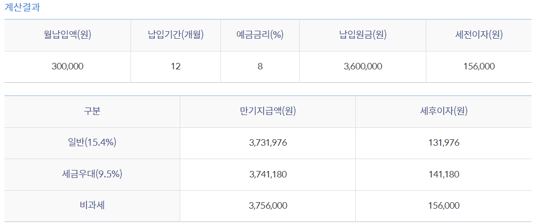 청년처음적금을 월 30만 원씩 납부했을 때 만기금액과 세후이자는 위와 같습니다.